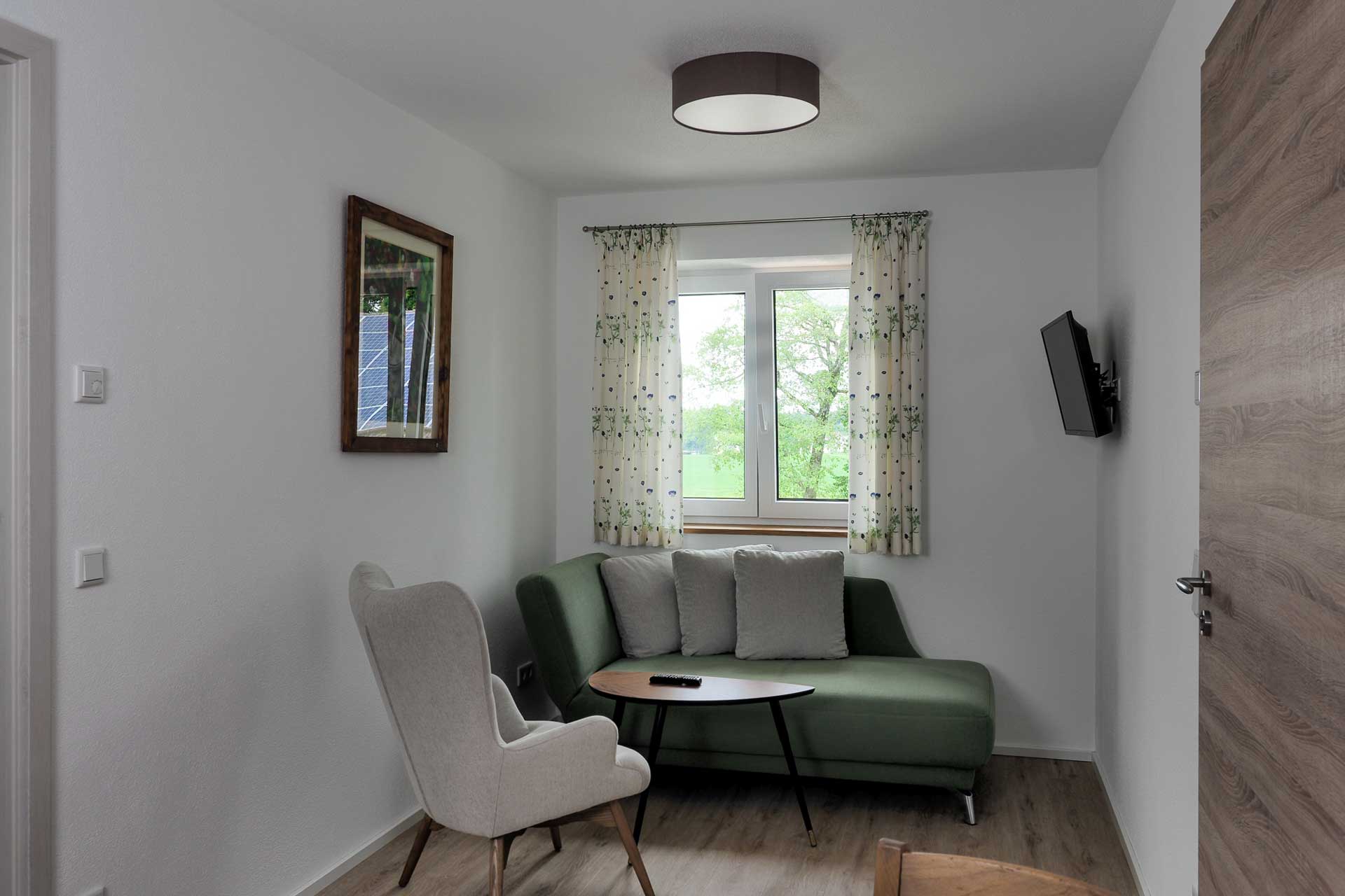 Unser mittelgroßes Appartement 5 ist ideal für alle, die allein reisen und ein abgetrenntes Schlafzimmer bevorzugen oder zu zweit oder zu dritt unterwegs sind. Die modern ausgestattete Ferienwohnung mit Bad (Dusche und WC) verfügt über ein Schlafzimmer, mit einem von unserem Schreiner handgefertigten flexiblen Doppelbett, welches sowohl als Ehebett als auch getrennt als zwei Einzelbetten gestellt werden kann. Im Wohn-/Essbereich finden Sie neben einer voll ausgestatteten Küchenzeile, eine Sitzgelegenheit zum Essen oder Arbeiten, außerdem eine gemütliche TV- und Leseecke, die zu einem weiteren Schlafplatz umfunktioniert werden kann. Das Appartement liegt im ersten Stock, ist barrierefrei mit dem Aufzug erreichbar und mit einer rollstuhlgerechten Tür zum Badezimmer ausgestattet. Neben TV, haben Sie Zugang zum kostenlosen WLAN. Bei Bedarf stellen wir gerne Babybett und Kinderstuhl zur Verfügung. Hand- und Geschirrtücher sowie Bettwäsche sind vorhanden.